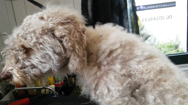 Boomer in de trimsalon. Zij heeft een knip beurt gehad , ze is lekker in bad geweest . De prijs voor deze knip beurt is € 45,- dit is incl, bad, nagels, anaalklieren, oortjes.